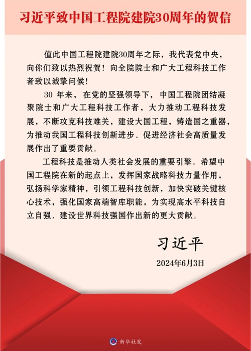 視頻來源:中央廣播電視總臺 習(xí)近平致信祝賀中國工程院建院30周年強調(diào) 發(fā)揮國家戰(zhàn)略科技力量作用 為實現(xiàn)高水平科技自立自強建設(shè)世界科技強國作出新的更大貢獻(xiàn) 丁薛祥出席院士座談會并講話 新華社北京6月3日電 在中國工程院建院30周年之際,中共中央總書記、國家主席、中央軍委主席習(xí)近平發(fā)來賀信,代表黨中央致以熱烈祝賀,向全院院士和廣大工程科技工作者致以誠摯問候。 習(xí)近平在賀信中指出,30年來,在黨的堅強領(lǐng)導(dǎo)下,中國工程院團(tuán)結(jié)凝聚院士和廣大工程科技工作者,大力推動工程科技發(fā)展,不斷攻克科技難關(guān),建設(shè)大國工程,鑄造國之重器,為推動我國工程科技創(chuàng)新進(jìn)步、促進(jìn)經(jīng)濟(jì)社會高質(zhì)量發(fā)展作出了重要貢獻(xiàn)。 習(xí)近平強調(diào),工程科技是推動人類社會發(fā)展的重要引擎。希望中國工程院在新的起點上,發(fā)揮國家戰(zhàn)略科技力量作用,弘揚科學(xué)家精神,引領(lǐng)工程科技創(chuàng)新,加快突破關(guān)鍵核心技術(shù),強化國家高端智庫職能,為實現(xiàn)高水平科技自立自強、建設(shè)世界科技強國作出新的更大貢獻(xiàn)。 3日上午,中國工程院在京舉行“踐行工程科技使命 推進(jìn)科技強國建設(shè)”院士座談會。中共中央政治局常委、國務(wù)院副總理丁薛祥出席會議,宣讀習(xí)近平賀信并講話。 丁薛祥在講話中指出,中國工程院成立30年來,堅決貫徹黨中央和國務(wù)院決策部署,大力推動工程科技發(fā)展,匯聚一流創(chuàng)新人才、產(chǎn)出一流科技成果、貢獻(xiàn)一流咨詢建議、打造一流學(xué)術(shù)平臺,在國家發(fā)展進(jìn)步中發(fā)揮了重要作用。 丁薛祥強調(diào),在新時代新征程上,中國工程院要牢記建院初心、傳承光榮傳統(tǒng),在學(xué)習(xí)貫徹習(xí)近平總書記重要指示精神、為高水平科技自立自強而奮斗的進(jìn)程中爭當(dāng)排頭兵。要當(dāng)國家戰(zhàn)略科技力量的排頭兵,牢牢把握新一輪科技革命和產(chǎn)業(yè)變革的戰(zhàn)略機遇,奮力搶占科技制高點。要當(dāng)工程科技創(chuàng)新的排頭兵,解決好重大工程科技問題,推進(jìn)科技創(chuàng)新成果產(chǎn)業(yè)化應(yīng)用,更好服務(wù)新質(zhì)生產(chǎn)力發(fā)展。要當(dāng)突破關(guān)鍵核心技術(shù)的排頭兵,從國家急迫需要和長遠(yuǎn)需求出發(fā),加強“卡脖子”技術(shù)攻關(guān),力爭在重要領(lǐng)域取得更多原創(chuàng)性突破。要當(dāng)國家高端智庫建設(shè)的排頭兵,緊緊圍繞具有戰(zhàn)略性方向性全局性的重大問題,加強前瞻性、針對性、儲備性戰(zhàn)略研究,支撐黨和國家決策。丁薛祥希望廣大工程院院士帶頭大力弘揚科學(xué)家精神,把人生理想融入國家和民族的事業(yè)中,深懷愛國之心、秉持報國之志、勇攀科技高峰,不負(fù)黨和人民的殷切期望。 座談會上,中國工程院負(fù)責(zé)人和院士代表作了發(fā)言。 中國工程院成立于1994年6月3日。30年來,中國工程院牢記中國工程科技界最高學(xué)術(shù)機構(gòu)職責(zé)使命,聚力科技創(chuàng)新、匯聚領(lǐng)軍人才、建設(shè)高端智庫、堅持學(xué)術(shù)引領(lǐng),取得了一系列重大成果。 |